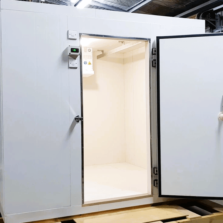 Our walk in chillers and freezers are made from high grade 100mm polyurethane panels with 0.5mm two side colour plate (Baosteel brand) which is more durable and ensures a lifetime of 20+ years. Featuring a hinged door using famous German brand hinges. Panels are locked in with zinc coated cam locks. Choose from one of our standard sizes or can be made to order. Accessories can be purchased also please see our Accessories page.